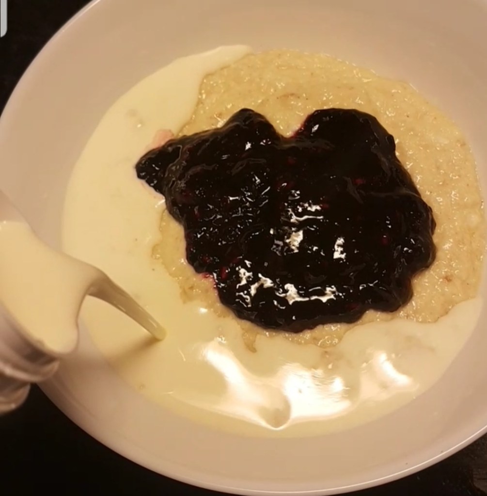 Serve with homemade jam, this time I made blueberry and raspberry jam and topped it all with some heavy cream.